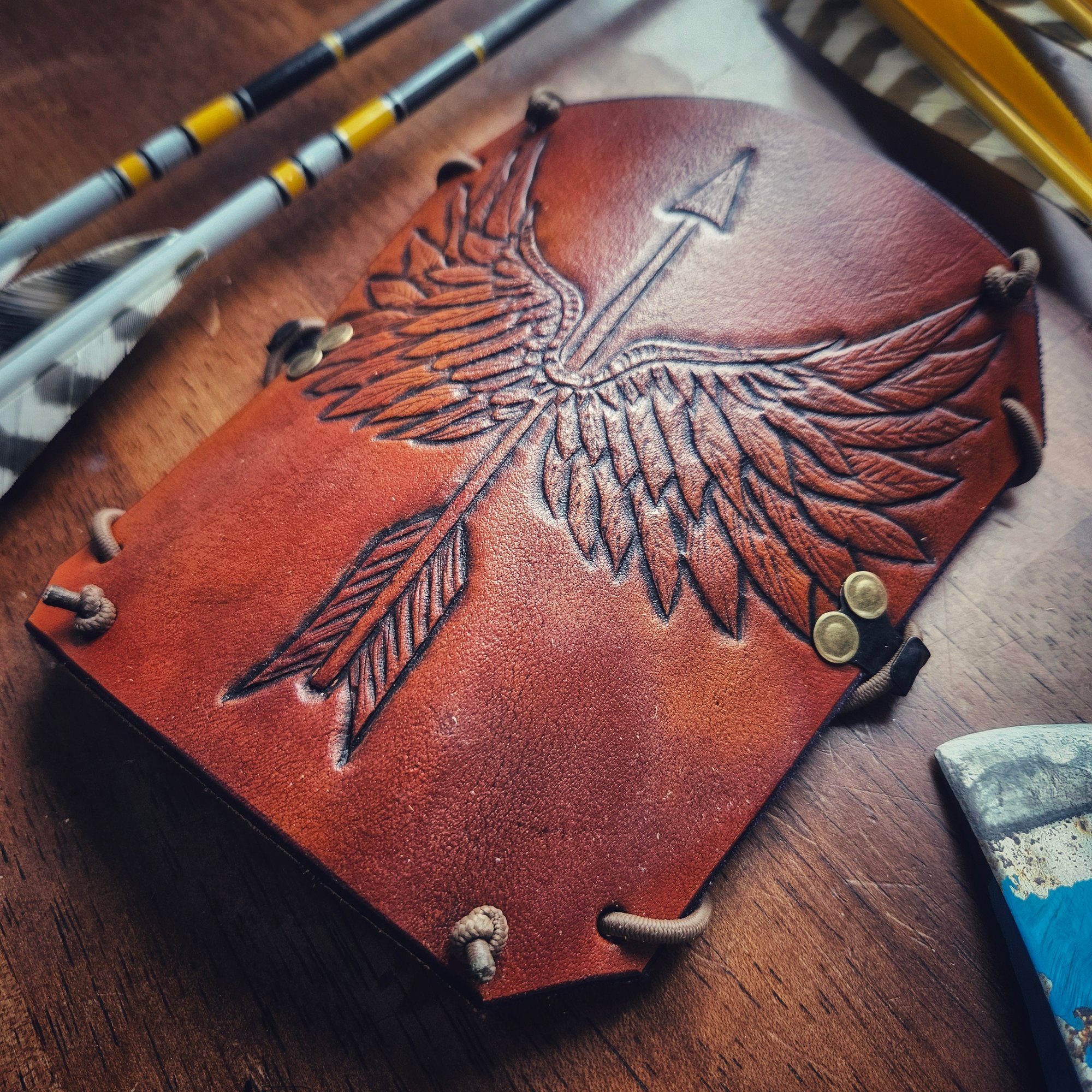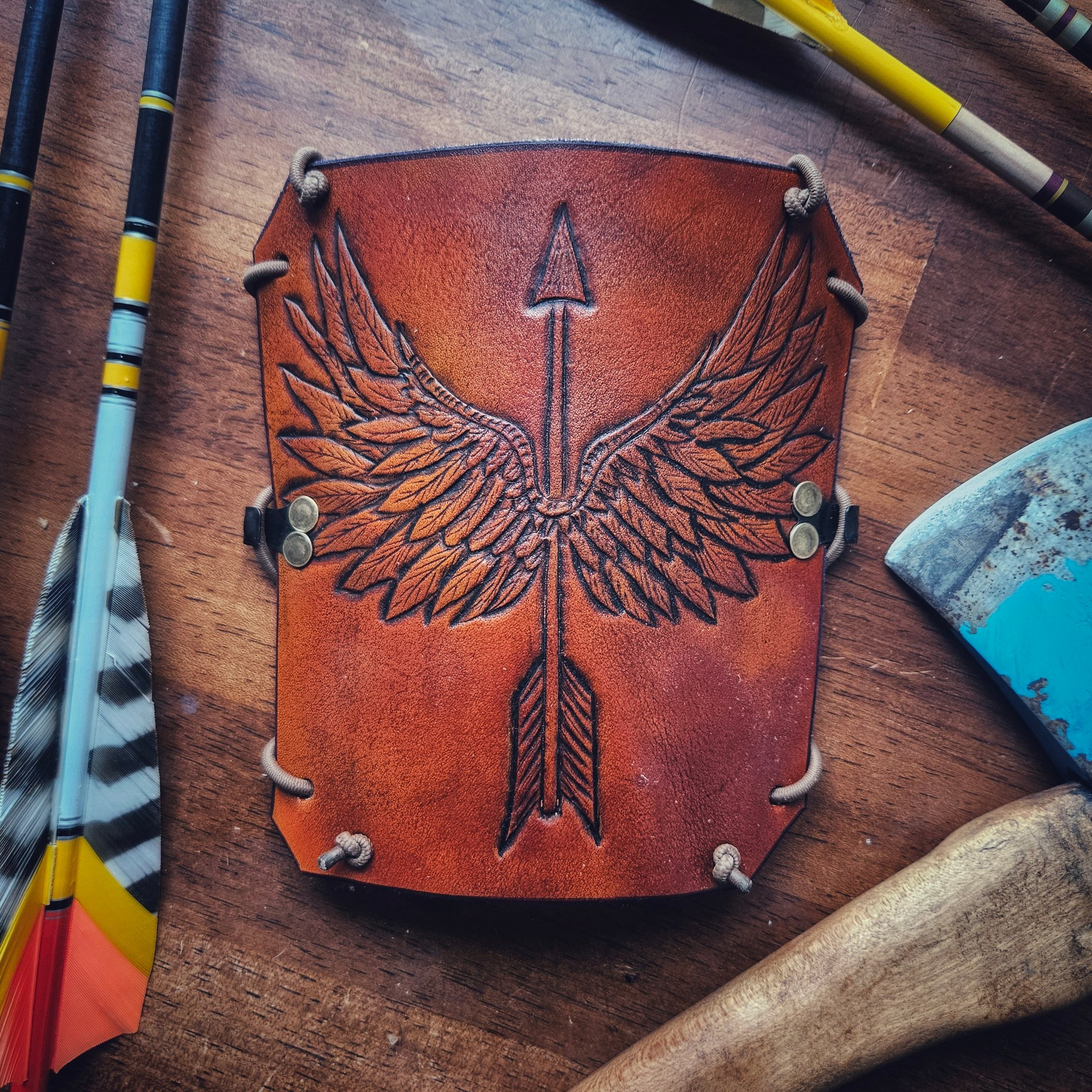 Up for grabs is this one of a kind archery armguard with hand tpoled design of an arrow with wings. Made using 5oz hand dyed veg tanned leather and backed with 4oz suede for comfort and grip. Metal hooks and high quality shock cord is fully adjustable to fit over clothing or next to skin. Stand out on the firing line with this sweet armguard!