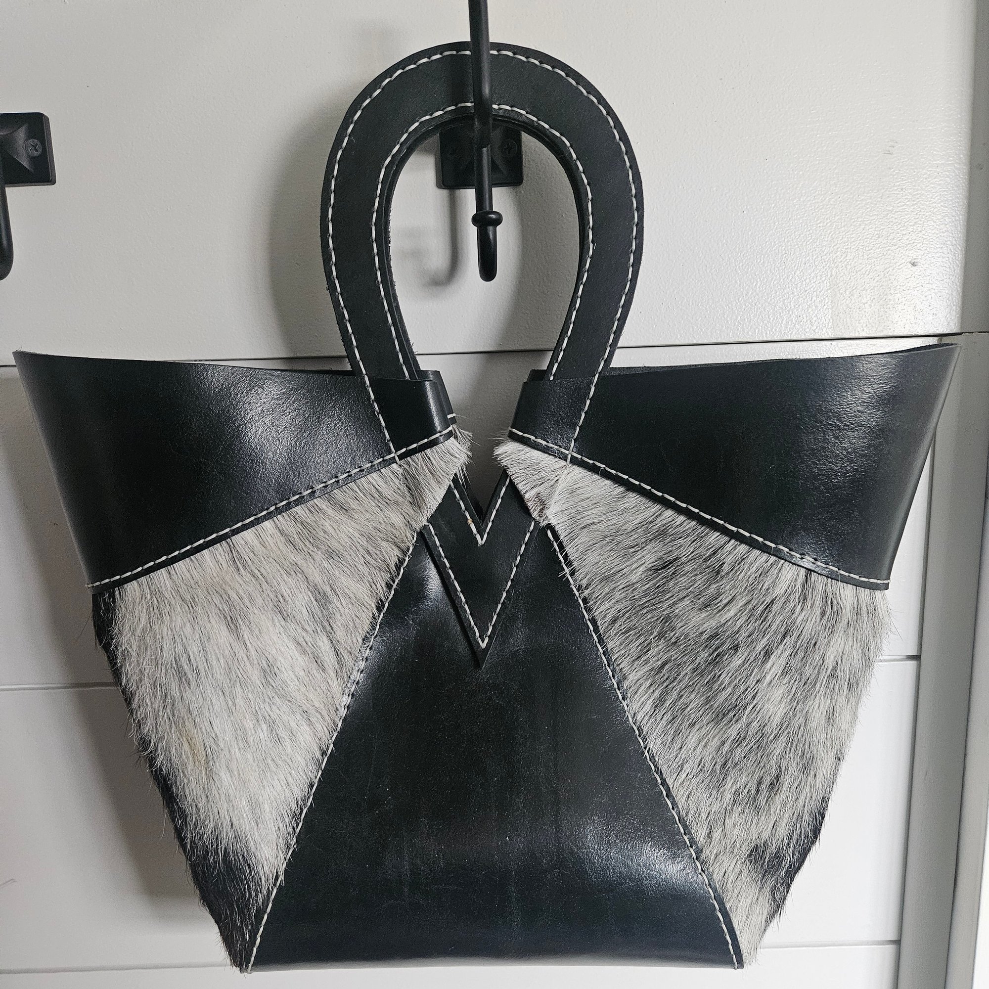 This handmade leather tote bag is made using heavy chrome tanned leather and hair on leather. This bag can be worn for any occasion. Loop style handles.