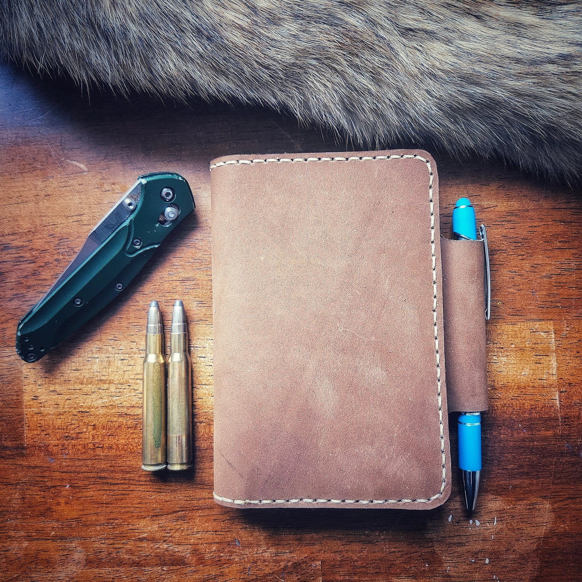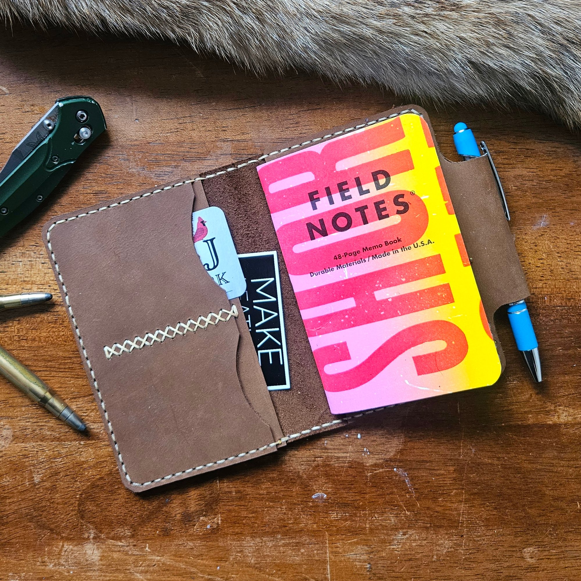 Handmade leather Field Notes or Passport wallet. This wallet is made with 100% chrome tanned leather and includes a Field Notes Notebook. Add you favorite pen or market and you are good to go.