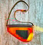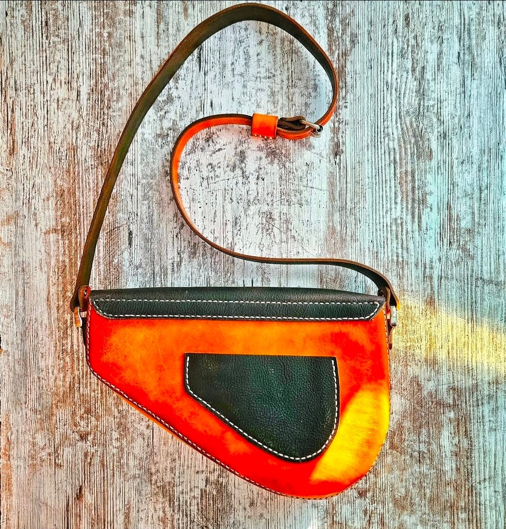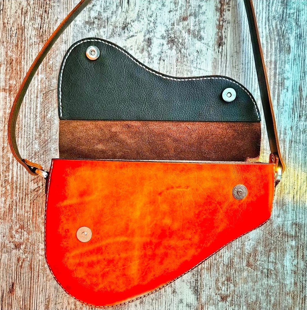 This unique bag is made with a combination of chrome and hand dyed veg tanned leathers. It features a double magnetic snap closure flap with a rear back pocket and leather strap that can be worn over the shoulder or crossbody.
