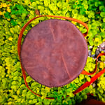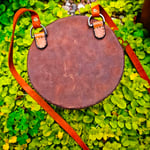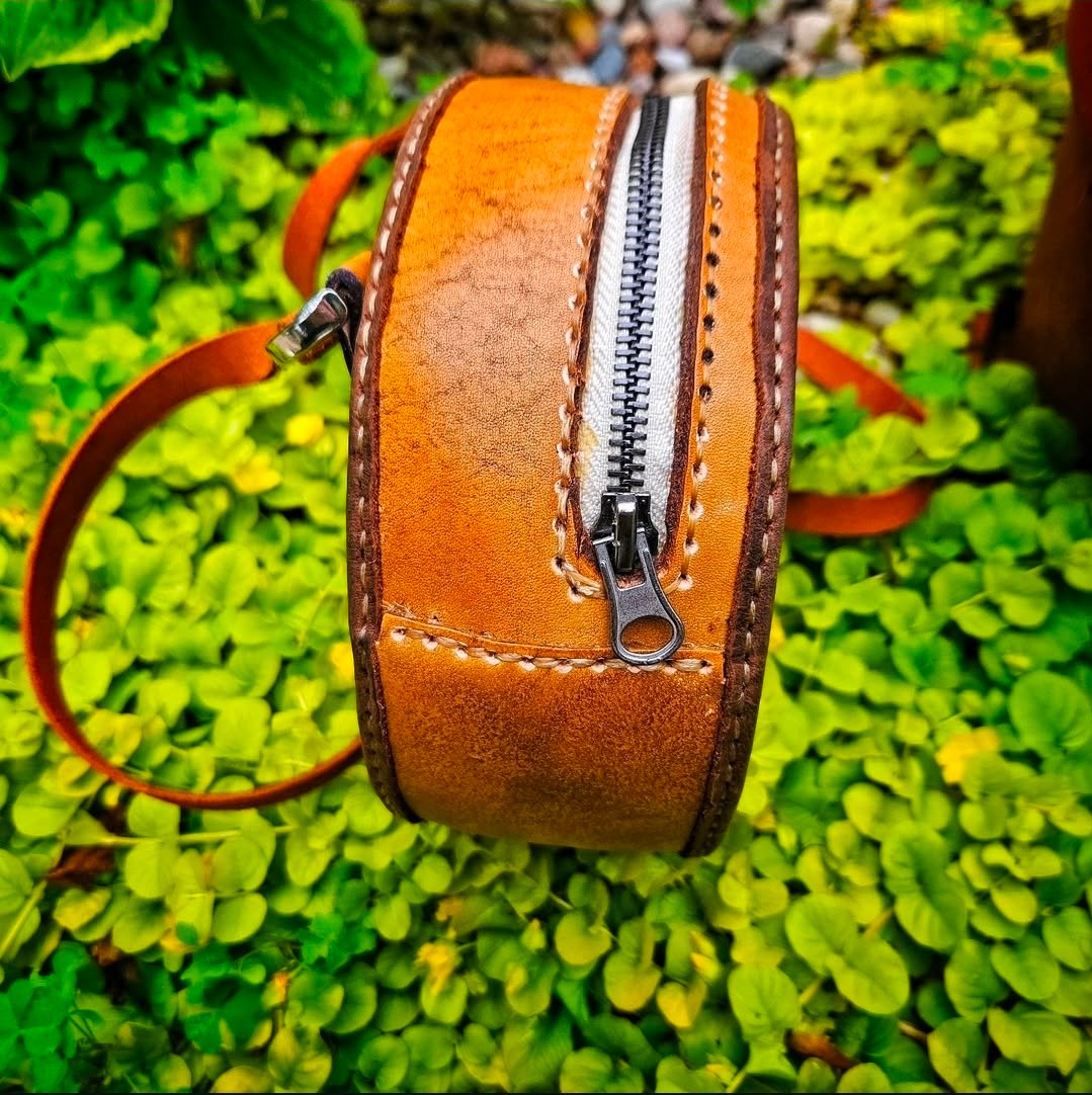 Handmade round leather purse made with a combination of hand dyed veg tanned leather and chrome tanned leather. Zipper closure, leather strap can be worn crossbody or over the shoulder.
